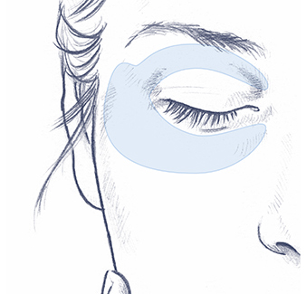 Durchtränkte Pads aus der Folie entnehmen und jeweils ein Pad mit der schmalen Seite oben beginnend auf das unbewegliche Augenlid, bis zur unteren Augenpartie auflegen. Nach ca. 10 – 15 Minuten abnehmen und das überschüssige Serum einmassieren.